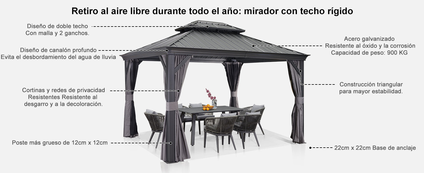 - Techo de acero galvanizado: el pabellón de techo rígido es impermeable, estable y resistente al invierno, a la oxidación y con protección UV de 50+