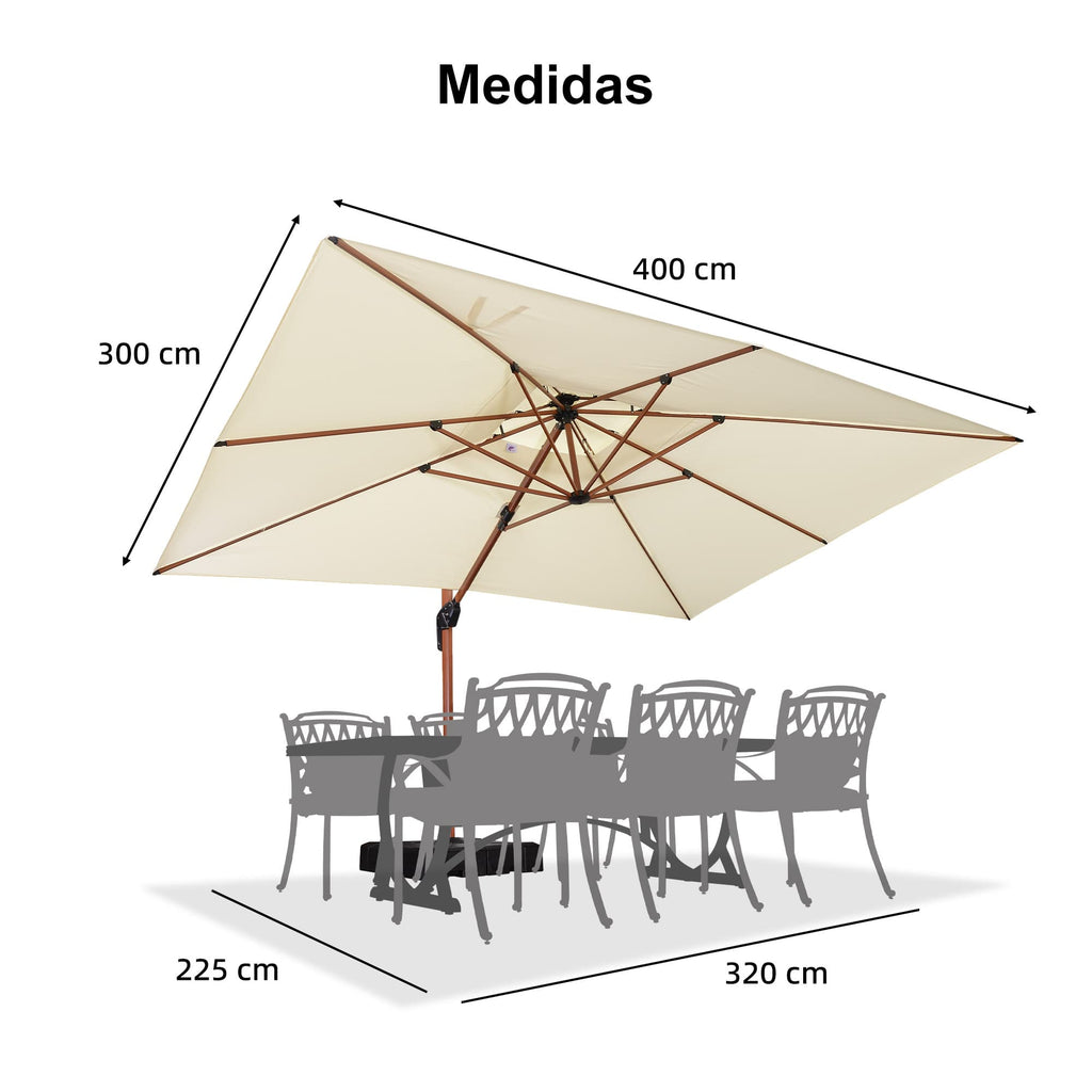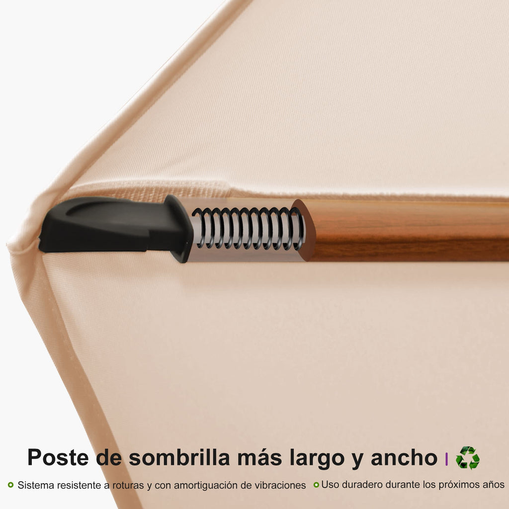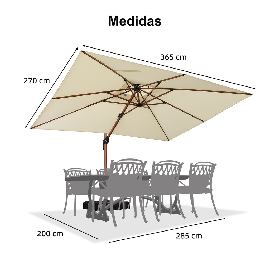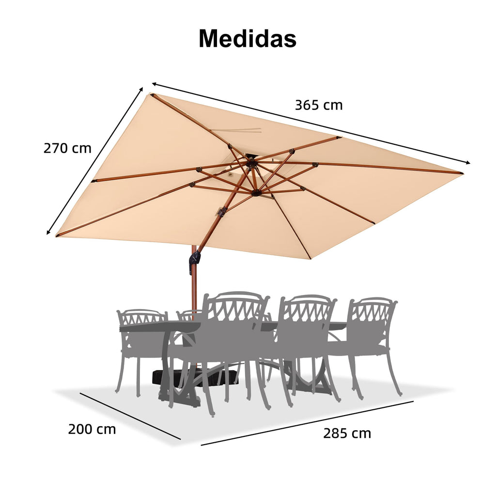 Nuestra sombrilla, fabricada con gran atención al detalle, cuenta con un sistema de doble cubierta que ofrece una sombra superior y un diseño de brazo con manivela sin mástil central, lo que proporciona una vista despejada y más espacio libre para disfrutar al máximo.